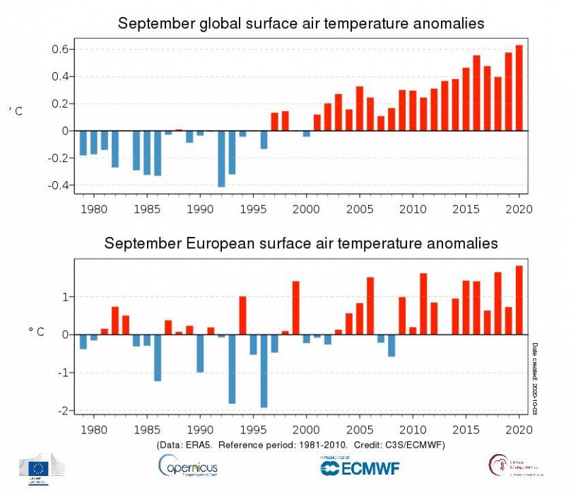 Küresel olarak, Eylül 2020, 2019'dan 0.05°C, 2018'den ise 0.08°C daha sıcak geçerek, C3S'ün listesindeki en sıcak ikinci eylül ayı oldu. Sibirya'nın kuzey kıyılarında, Ortadoğu'da ve Güney Amerika ile Avustralya'da sıcaklıklar mevsim normallerinin üzerinde seyretti.
