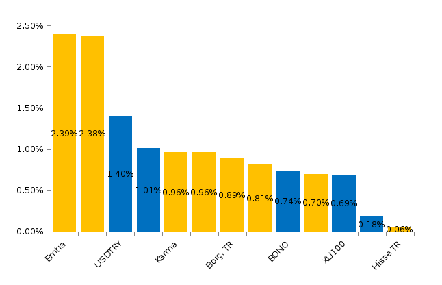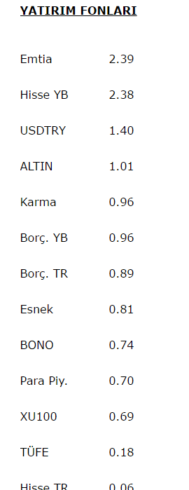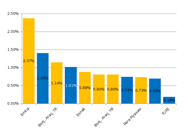 Yatırım fonlarında ayın en yüksek getirisini ortalama %2,39 ile Emtia fonları verdi. Bu fonları %2,38 getiriyle Yabancı Hisse Senedi fonları izledi. En düşük getiri %0,06 ile Yerli Hisse Senedi fonlarında oluştu.