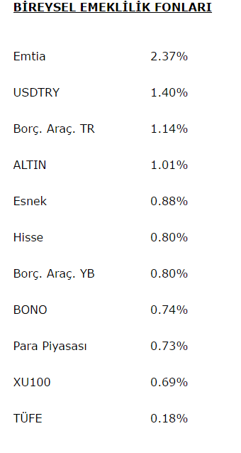 Bireysel emeklilik fonlarında en yüksek getiri ortalama %2,37 ile Emtia fonları kategorisinden geldi. Onu %1,14 getiri ile Yerli Borçlanma Araçları fonları izlerken en düşük getiri %0,73 ile Para Piyasası fonlarında oluştu.