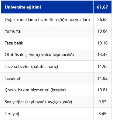 Türkiye İstatistik Kurumu (TÜİK) verilerine göre, üniversite eğitimindeki fiyat artışını, yüzde 36,62 ile diğer konaklama hizmetleri (öğrenci yurtları) ve yüzde 19,84 ile yumurta izledi.