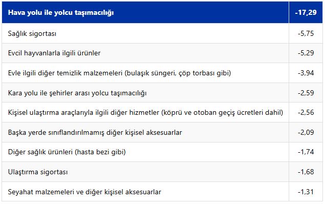Geçen ay en fazla fiyat düşüşü, yüzde 17,29 ile hava yoluyla yolcu taşımacılığında gerçekleşti. Bunu yüzde 5,75 ile sağlık sigortası, yüzde 5,29 ile evcil hayvanlarla ilgili ürünler, yüzde 3,94 ile evle ilgili diğer temizlik malzemeleri (bulaşık süngeri, çöp torbası gibi), yüzde 2,59 ile kara yoluyla şehirler arası yolcu taşımacılığı takip etti.