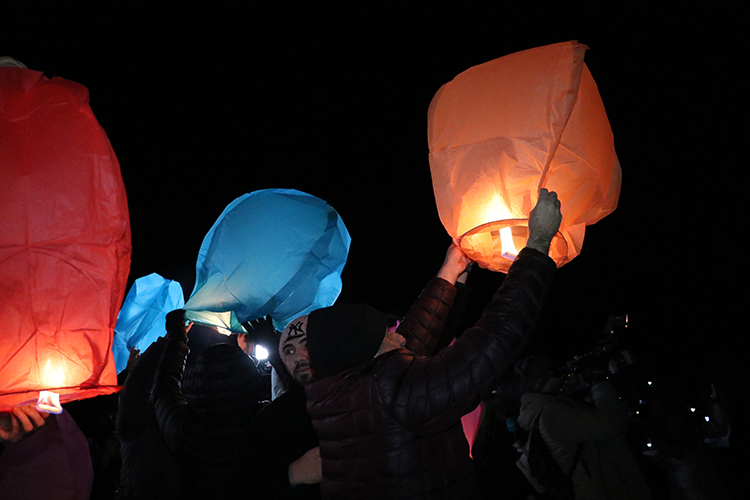Otelin önündeki alana hayatını kaybedenlerin fotoğraflarının konulmasının ardından karanfiller bırakıldı, mumlar yakıldı, dilek balonları gökyüzüne uçuruldu.