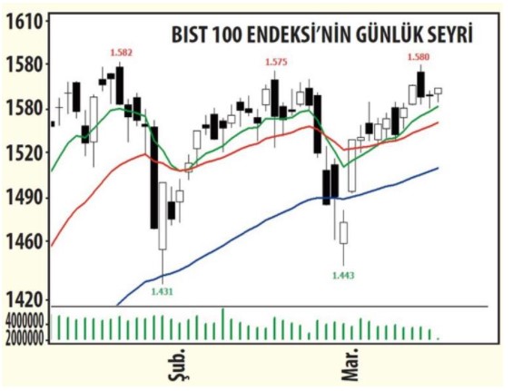 BIST 100 Endeksi 1582 seviyelerinde üçlü tepe oluşturdu. Endeks şimdilerde 8, 20 ve 50 günlük ortalamanın üzerinde tutunuyor. 1550, 1539 ve 1508 destek seviyeleri... 1582 yukarı kırıldığında hareketin başlama sinyali olarak algılanacaktır. Bu seviyenin üzerinde 1750 - 1800 seviyeleri hedef olacaktır. Öte yandan borsada yabancıların payı yüzde 44.93 seviyesinde bulunuyor. Yabancılar satış yapmaya devam ediyor. Bu da hisse senetlerini baskılıyor.