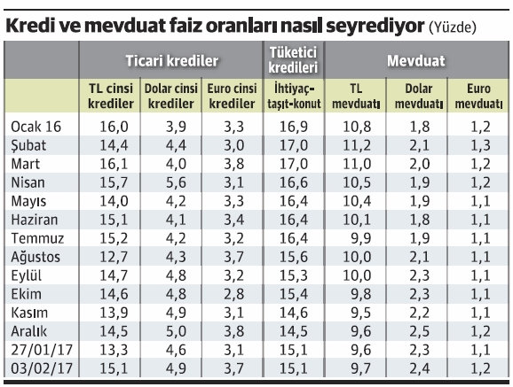2016 başından bu yana olan dönemin ticari kredi faizlerine, tüketici kredisi faizlerine ve mevduat faizlerine bakıyoruz. Özellikle 2016 sonu ile bu yılın ocak ayı sonu ve 3 Şubat verileri ilginç bir hareketlenmenin somut işaretlerini veriyor.