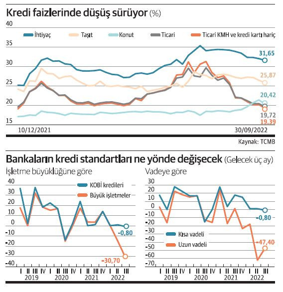 Dünya'dan Şebnem Turhan'ın konuyla ilgili haberi şöyle: Türkiye’de kredi faizleri Merkez Bankası’nın son iki faiz indirimi ve aldığı makroihtiyati önlemlerle hızla gerilese de bankalar kredi koşullarını sıkılaştırmaya devam ediyor. Merkez Bankası banka kredileri eğilim anketinin sonuçları geride bırakılan üçüncü çeyrekte işletmelere kullandırdıkları kredilere uyguladıkları standartları sıkılaştırdığını gösterirken son çeyrekte ise bütün işletme kredilerinde standartların daha da sıkılaşacağını ortaya koydu. Merkez Bankası Aralık 2021’den sonra temmuz ve ağustos Para Politikaları Kurulu toplantılarında uzun süredir yüzde 14’te sabit bıraktığı politika faizinde indirim döngüsüne başladı. Politika faizi iki toplantıda 100’er baz puan indirildi ve yüzde 12’ye çekildi. Cumhurbaşkanı Erdoğan da faizde indirimin süreceği ve tek haneye gerileyeceğine sık sık açıklamalarında yer veriyor. Politika faizi inerken kredi faizlerinde de düşüş yaşanıyor ancak kredilerin kullanım standartları gevşeme bir yana daha da sıkılaşıyor. Bankacılık sektörünün kredi koşullarındaki eğilimler ise Merkez Bankası’nın banka kredileri eğilim anketinden takip ediliyor.