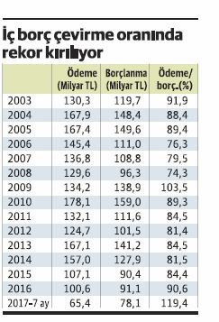 Bu yıl içinde bazı aylarda çok yüksek oranlarla karşılaşıldı. Temmuz ayındaki iç borç çevirme oranı yüzde 144'ü aştı. Nisandaki oran yüzde 173'e ulaşmıştı ama kabul etmek gerekir ki söz konusu aydaki ödeme ve borçlanma tutarları ihmal edilebilecek düzeyde düşüktü.