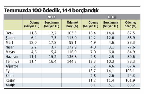 Oysa bu yılın ilk yedi aylık gerçekleşmesinde yüzde 119.4'lük bir orana çıkıldı. Hazine ocak-temmuz döneminde 65.4 milyar lira ödemeye karşılık 78.1 milyar lira borçlandı.