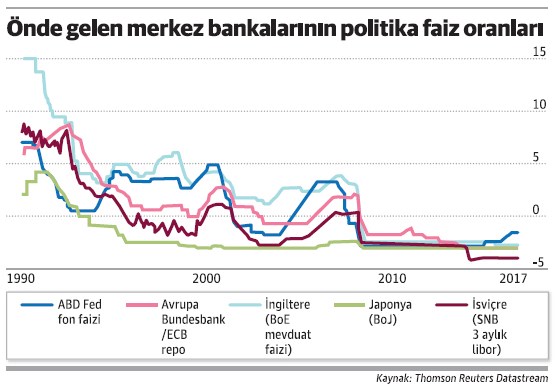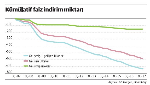 Borç verenlerin borçlulara ödeme yaptığı dönem. İnsan, ‘bu konuda normal olan ne diye’ düşünmeden de edemiyor. ABD’li yatırım bankası J.P. Morgan tarafından hazırlanan bir analize göre, 2007 üçüncü çeyreği ile Ekim 2017 tarihleri arasında küresel arenada yer alan merkez bankaları bin 100’den fazla faiz hamlesi gerçekleştirirken, bu adımların 700’den fazlası faiz indirimi şeklinde oldu. Bir faiz indiriminin diğer faiz indirimini izlediği momentumda rüzgâr gelişen ülkelerde tersine dönmeye başladı.