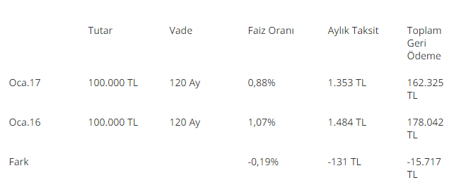 Bu ay 100 bin lira konut kredisini 36 ay yerine 120 ay vade ile kullanmak isteyen tüketici vade ve faiz oranlarındaki fark sebebiyle 46 bin lira daha fazla faiz ödemek zorunda. Bu ciddi ödeme farkından dolayı taksit tutarlarında zorlanmayacak tüketicilerin olabildiğince kısa vadeleri tercih etmeleri öneriliyor.
