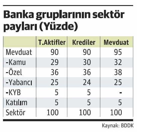 BDDK’nın verilerine göre, mevduatın yüzde 32’sini kamu sermayeli 3 bankamız, yüzde 38’ini özel sermayeli bankalar, yüzde 25’ini yabancı sermayeli bankalar topluyor.