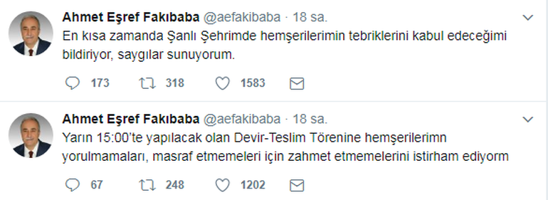 Fakıbaba'nın bugün saat 15.00'da yapılan devir teslim töreni ile ilgili attığı tweet, Şanlıurfa'da çok konuşuldu. Tören için Urfa'dan gelecek hemşerilerine hitap eden Fakıbaba şunları yazdı:
