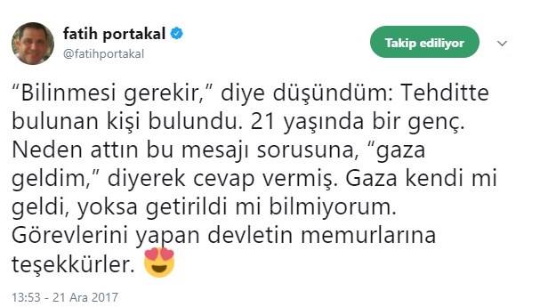 "Bilinmesi gerekir, diye düşündüm: Tehditte bulunan kişi bulundu. 21 yaşında bir genç. Neden attın bu mesajı sorusuna, "gaza geldim," diyerek cevap vermiş. Gaza kendi mi geldi, yoksa getirildi mi bilmiyorum. Görevlerini yapan devletin memurlarına teşekkürler."