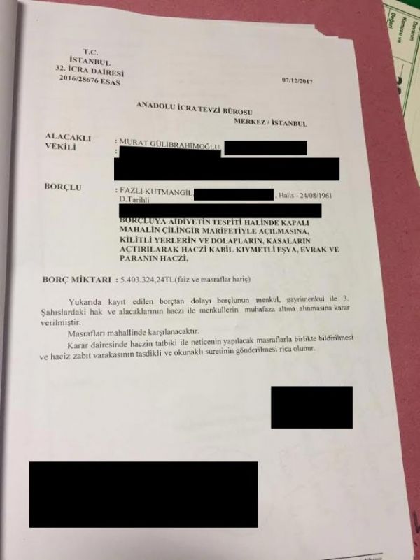 Özellikle madencilik alanında adını duyuran Kutman şirketler grubunda Fazlı Kutmangil halen aktif olarak şirketlerinin yönetiminde bulunuyor. İddiaya göre onu icralık eden konu ise İş adamı Murat Gülibrahimoğlu’ndan 5 milyon 403 bin lira borç alması. Gülibrahimoğlu’nun avukatları, banka dekondunu delil göstererek borcun ödenmemesi sonucu icra işlemlerine başladı. Önceki gün Fazlı Kutmangil’in Üsküdar Kandillideki ikametine giden haciz memurları ve avukatlar önce evin önünde bulunan Bentley marka lüks otomobili haczetti.