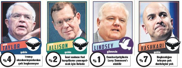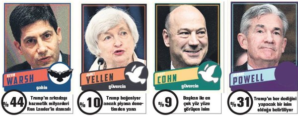 Her gün yeni bir adayın dillendirildiği Fed'de Yellen'in görev süresi şubat ayında doluyor ancak yeni başkanın ay sonuna kadar isminin açıklanacağı belirtiliyor. Yani dünya ekonomisini yönlendiren merkez bankasının başına geçecek isim en geç kasım ayı başında belli olacak.