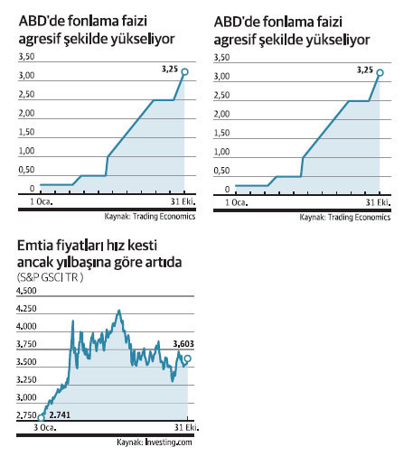 Fed, bu yılın başlarında enflasyondan “geçici” olarak değerlendirmeyi bir kenara bıraktı ve fiyatları kontrol etme konusunda harekete geçerek faiz oranlarını mart ayından bu yana 300 baz puan artırdı. S&P 500 borsa endeksi mart sonundan bu yana değerinin yaklaşık yüzde 20'sini kaybetti. Emtiaya bakıldığında bazı metaller yılın zirvesine göre yüzde 30’a yakın kayıp verdi. Petrol fiyatları mart ayında 125 doları aşmışken, 95 dolar bandına çekildi. Ancak fiyatların halen yılbaşına göre yüksek olması, enflasyon söz konusu olduğundan ekonomisini bile riske atmaktan geri durmayan Fed’in frene basmasını engelliyor. Emtia fiyatlarını izleyen S&P GSCI Endeksi yılbaşından su yana yüzde 25’ten fazla yukarıda iken, Brent petrolünün fiyatı sene başına göre yüzde 22 yüksek.