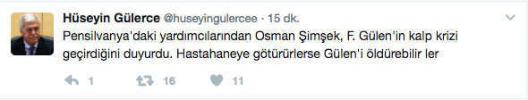 Bir dönem Gülen cemaatine yakınlığıyla bilinen Star yazarı Hüseyin Gülerce, Gülen'in Pensilvanya'daki yardımcısı Osman Şimşek'in, kalp krizine ilişkin attığı tweet'i aktardı. Gülerce, Gülen'in hastaneye götürülmesi halinde öldürülebileceğini iddia etti.
