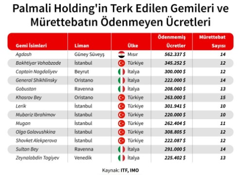 Uluslararası Taşımacılık İşçileri Federasyonu (ITF), Akdeniz'de terk edilen Palmali Holding'e ait gemilerin mürettebatının ödenmemiş ücretlerinin toplamının 3,2 milyon dolardan fazla olduğunu açıkladı.