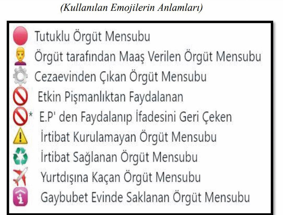 FETÖ’nün telefon uygulamalarındaki emojileri şifreleme için kullandığı ortaya çıktı. Örgüt mensubu kişinin konumunu önceden belirledikleri emoji aracılığıyla kayıt altına alan FETÖ, bu şekilde Türkiye’deki mensuplarını gruplara ayırdı. ‘Yurt dışına kaçan, gaybubet evlerinde saklanan, cezaevinde bulunan, etkin pişmanlıktan faydalanan, etkin pişmanlık ifadesini geri çeken, irtibat kurulamayan ve irtibat sağlanan’ örgüt mensuplarının isimlerinin karşısına durumlarını belirten emojilerin eklendiği tespit edildi.
