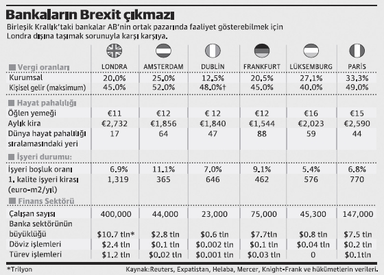 Londra, Avrupa finans piyasalarının kalbi olarak görülüyor. Ancak İngiltere bu ay 50.maddeyi yürürlüğe sokarak AB`den ayrılma sürecini (Brexit) resmen başlatmaya hazırlanırken, uluslararası bankalar Londra’daki merkezlerinde binlerce çalışanı İngiltere dışına taşımaya hazırlanıyor. Avrupa’daki birçok şehir de Londra’dan pay kapmak için adeta savaşıyor.