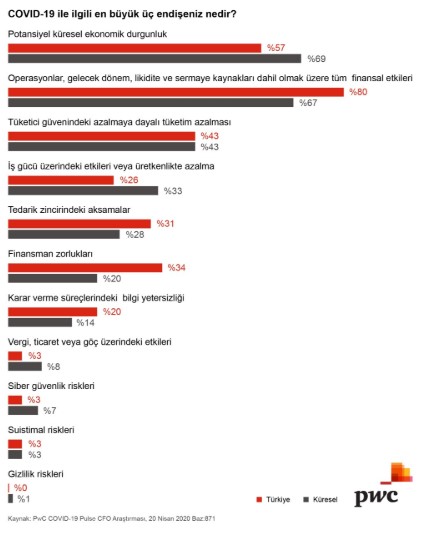 * Küresel finans liderlerinin endişelerinin başında; küresel ekonomik durgunluk olasılığı (%69) ve finansal etki (%67) geliyor. Türkiye CFO'larının çoğunluğu ise krizin finansal etkisi yönündeki endişelerini ilk sıraya koyuyor (%80).