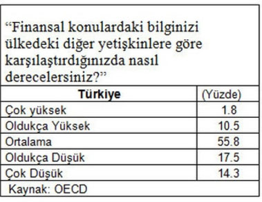 Türkiye’de araştırmaya katılanların yüzde 14’ü kendi finansal bilgisinin diğerlerinden ‘çok düşük’ olduğunu düşünüyor. Bu, kendini ‘Çok düşük’ görenlerde, 30 ülke içinde Belarus’tan sonra en yüksek ikinci sonuç. Türkiye’nin bilgi ölçümündeki sonuca göre yeri 30 ülkenin ortalaması olan yerde.