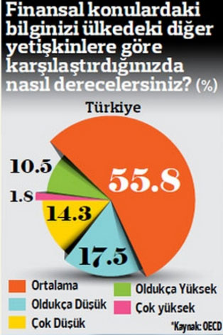 Asıl ilginç olan şu; finansal okur yazarlık ve yeterlilik ölçümü yapılırken “Finansal konulardaki bilginizi ülkedeki diğer yetişkinlere göre karşılaştırdığınızda nasıl derecelersiniz?” diye sorulmuş. “Çok yüksek” ve “Oldukça yüksek” diyenlerin toplamı en yüksek ülke Finlandiya çıkmış. İlginç olan şu; Finlandiyalıların, bilgi ölçümünde 30 ülke içinde üçüncü sırada çıkmış olmaları. Yani, genel seviye oldukça yüksek. İlginç olan kendi aralarındaki karşılaştırmada kendi bilgisini diğerlerine göre çok yüksek görenlerin oranı da yüzde 39’da. Malum, eğitim sistemi küresel bir fenomen olan Finlandiya, PISA sonuçlarında da ilk sıralarda yer alan bir ülke.