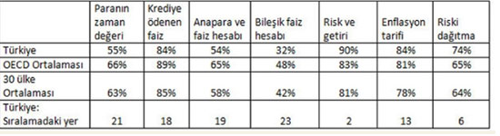 Türkiye’deki sonuçlar, 7 ana gruptaki bilgi ölçümünde üç konuda oldukça iyi bir tablo ortaya çıkarıyor. Aslında Türkiye’de halkın günlük yaşamda yüz yüze olduğu sorunlardan edindiği deneyimlerin bir sonucu olarak görece iyi çıkmış üç ölçüm başlığı şunlar: Risk ve getiri kavramı, enflasyon tarifi ile riski dağıtma konuları.