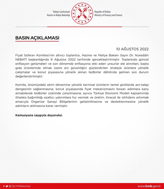 Fiyat İstikrarı Komitesi altıncı toplantımızı gerçekleştirdik. pic.twitter.com/1mmpkTC3DD