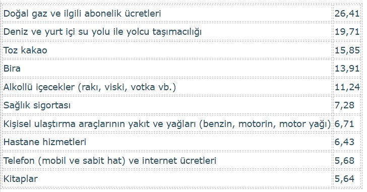 Türkiye İstatistik Kurumu (TÜİK) verilerine göre, doğal gaz ve ilgili abonelik ücretlerindeki fiyat artışını, yüzde 19,71 ile deniz ve yurt içi su yolu ile yolcu taşımacılığı ve yüzde 15,85 ile toz kakao izledi.