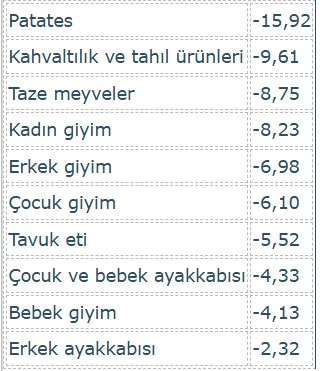 Geçen ay en fazla fiyat düşüşü, yüzde 15,92 ile patateste gerçekleşti. Bunu yüzde 9,61 ile kahvaltılık tahıl ürünleri, yüzde 8,75 ile taze meyveler, yüzde 8,23 ile kadın giyim, yüzde 6,98 ile erkek giyim takip etti.