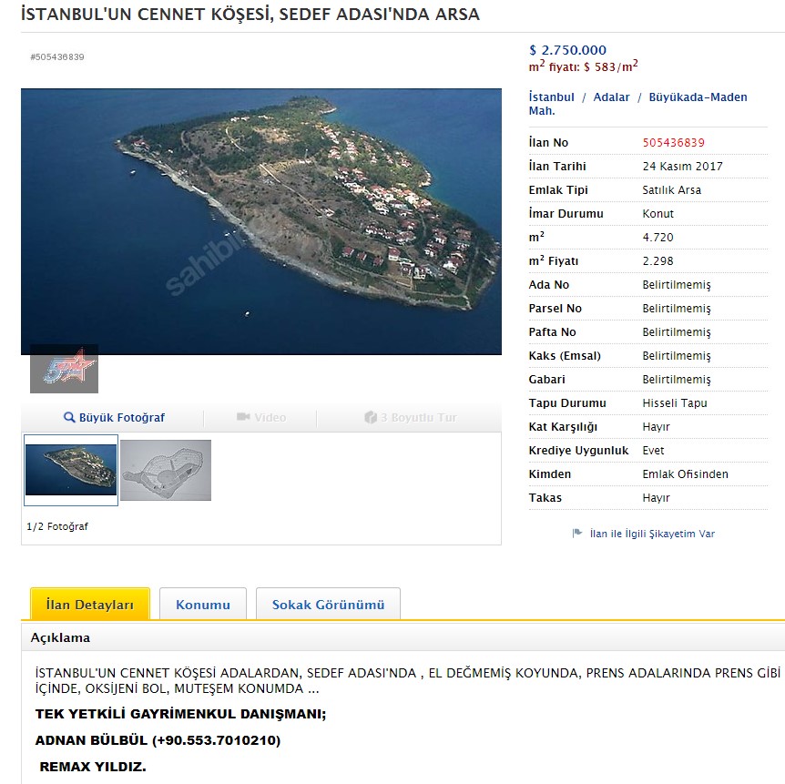 İlanda İstanbul’un usta emlakçılarından Adnan Bülbül ve şirketi dünyaca ünlü emlak firması Remax üyesi Remax Yıldız ismi dikkat çekiyor. İlanın altında ‘tek yetkili gayrimenkul danışmanı’ Adnan Bülbül yazıyor. İrtibat için telefon numarası yer alıyor. Suudi Prens ve işadamına ait iki ‘arsa’ için ilanlarda yayınlanan fiyatlara gelince, Prens arazisine 3 milyon dolar, diğerine ise 2 milyon 750 bin dolar isteniyor. Metrekare birim fiyatları ise 636 dolar ve 583 dolar olarak belirlenmiş.