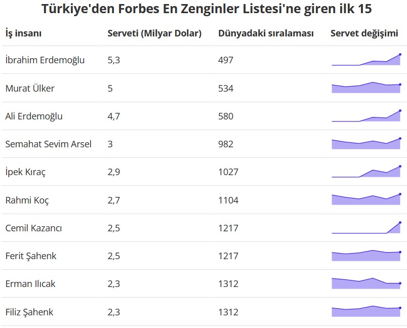 Listeye göre, Türkiye'nin en zengin milyarderi SASA Polyester'in sahibi İbrahim Erdemoğlu. Servetinin toplam değeri 5 milyar 300 milyon dolar olan Erdemoğlu genel listede 497. sırada yer alıyor.
