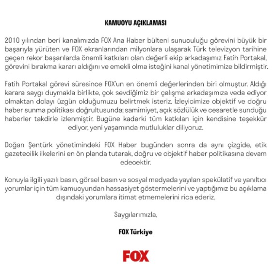 2010 yılından beri kanalımızda FOX Ana Haber bülteni sunuculuğu görevini büyük bir başarıyla yürüten ve FOX ekranlarından milyonlara ulaşarak Türk televizyon tarihine geçen rekor başarılarda önemli katkıları olan değerli ekip arkadaşımız Fatih Portakal, görevini bırakma kararı aldığını ve emekli olma isteğini kanal yönetimimize bildirmiştir.