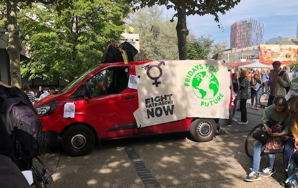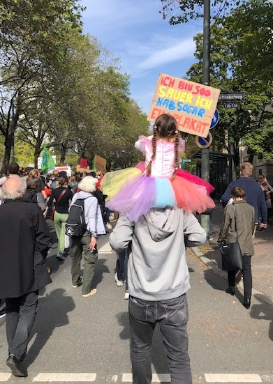 Gösteride en çok “Buradayız, bağırıyoruz çünkü geleceğimizi çalıyorsunuz” sloganı kullanıldı. Bir diğer sık kullanılan slogan İngilizce’ydi ve şu şekildeydi: Konuşmacı: Ne istiyoruz? Herkes: İklim adaleti! Konuşmacı: Ne zaman? Herkes: Hemen! Sloganlarda İngilizce kullanılmasının bir nedeni de bir Alman kentinde yapılan gösteride dünyanın her kıtasından insanların yan yana yürüyor olmasıydı…