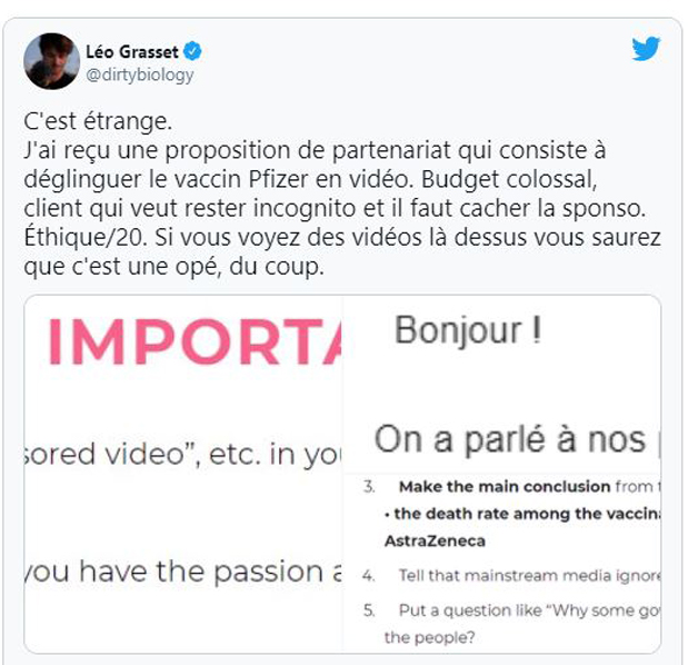 Diğer taraftan Grasset, kendisine sözde ajans tarafından gönderilen mesajda, eğer ortaklık teklifini kabul ederse "reklam" veya "sponsorlu video" gibi kelimeleri kullanmasının istenmediğini aktardı. Tüm bunlara ek olarak Grasset, Pfizer/BioNTech ile aşılanlar arasındaki ölüm oranının AstraZeneca aşısı olanlarda neredeyse üç kat daha yüksek olduğu şeklindeki yanlış bir iddiayı yaymasını istendiğini söyledi.