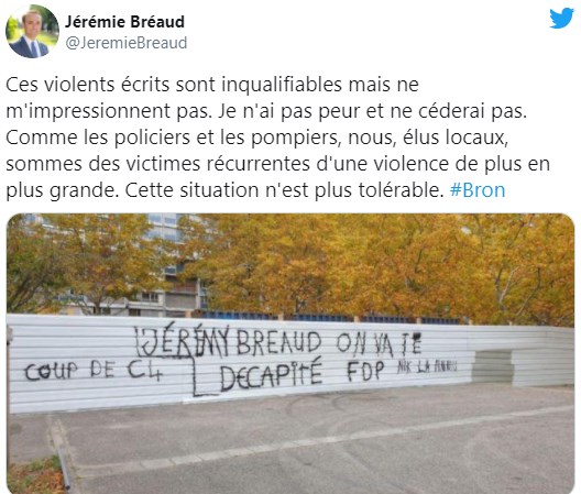 Euronews'de yer alan habere göre, Fransız BFM televizyonuna açıklamalarda bulunan belediye başkanı ülkenin en büyük ikinci şehri Lyon yakınlarındaki Bron kentinde bulunan bir duvar üzerinde "Jeremie Breaud, senin kafanı keseceğiz" yazısına rastladıklarını ve yetkililerin bu tehditleri ciddiye alması gerektiğini belirtti.