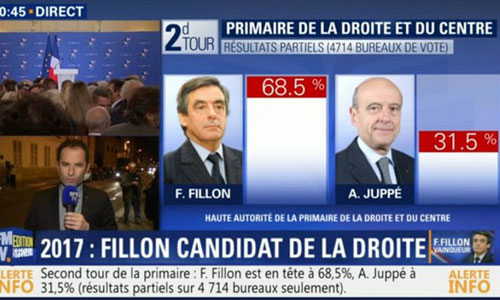 Cumhuriyetçiler Partisinin 20 Kasım'da düzenlenen ilk tur aday belirleme seçimini, Fillon yüzde 44,1 ile birinci, yine eski başbakanlardan Juppe yüzde 28,6 ile ikinci sırada tamamlamıştı. İlk turda eski Cumhurbaşkanı Nicolas Sarkozy ise yüzde 20,7 oyla üçüncü sırayı alarak partisinin cumhurbaşkanlığı adaylığı yarışında saf dışı kalmış ve ikinci turda Fillon'u desteklediğini açıklamıştı.