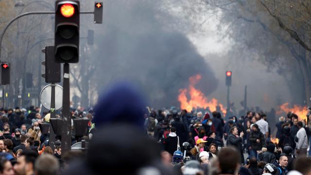 Göstericilerden bazıları Paris sokaklarındaki çöp ve çöp bidonlarını ateşe verdi, otobüs duraklarını tahrip etti.
