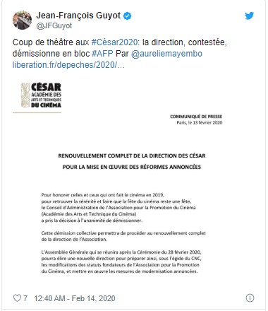AFP'den gazeteci Jean-Francois Guyot, Cesar Akademisi’nin açıklamasını Twitter üzerinden yayınladı. Açıklamada, "2019 yılında sinemanın gerçekleşmesini sağlayan kadın ve erkekleri onurlandırmak ve film festivalinin sadece bir festival olarak kalması adına Akademi’nin Yönetim Kurulu, oy birliğiyle istifa etmeye karar verdi" denildi.