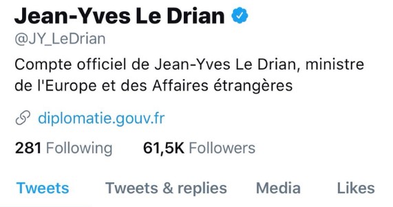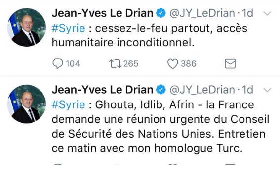 Diplomatik kaynaklardan edinilen bilgiye göre Dışişleri Bakanı Mevlüt Çavuşoğlu'nun Fransız mevkidaşıyla yaptığı telefon görüşmesinin ardından Fransa Dışişleri Bakanı Jean-Yves Le Drian Twitter üzerinden açıklama yaptı.