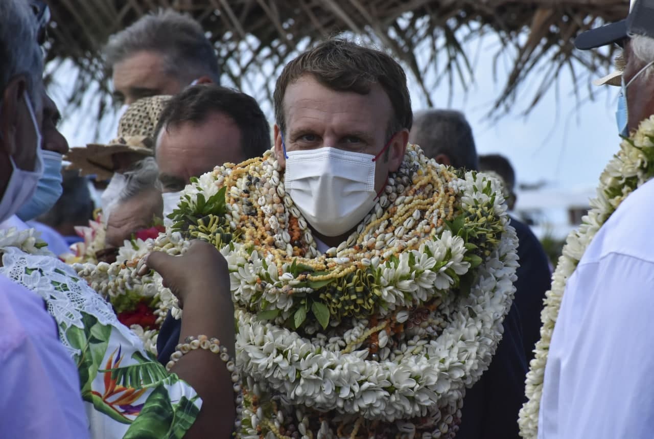 Macron’un Fransız Polinezyası’ndaki Markiz Adaları’nın ikinci büyük adası Hiva Oa’ya yaptığı ziyaret renkli görüntülere sahne oldu. Macron için hazırlanan geleneksel karşılama töreninde yüzlerce kişi dans etti.
