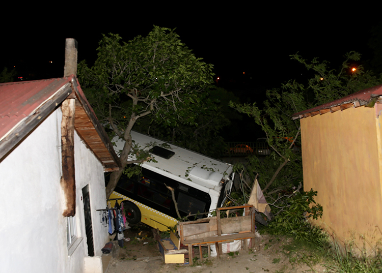 Kaldırımdaki ağaçları ve demir korkulukları kıran otobüs, bir evin bahçesine düştü.