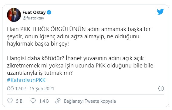 Fuat Oktay, paylaşımında "Hain PKK terör örgütünün adını anmamak başka bir şeydir, onun iğrenç adını ağza almayıp, ne olduğunu haykırmak başka bir şey! Hangisi daha kötüdür? İhanet yuvasının adını açık açık zikretmemek mi yoksa işin ucunda PKK olduğunu bile bile uzantılarıyla iş tutmak mı?" ifadelerine yer verdi.