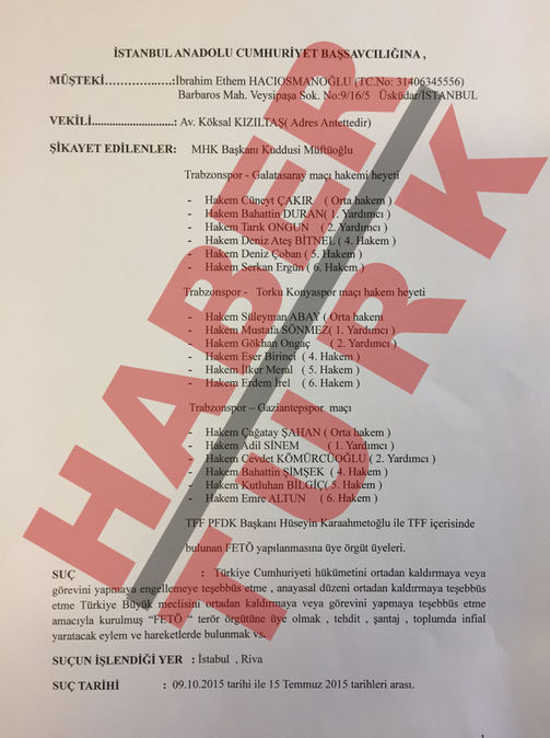 İbrahim Hacıosmanoğlu ise kasım ayında suç duyurusunda bulunmuştu. Hacıosmanoğlu, MHK eski başkanı Kuddusi Müftüoğlu, Disiplin Kurulu eski başkanı Hüseyin Karaahmetoğlu ve tam 18 hakem hakkında “TFF’de FETÖ yapılanması” yaptıkları iddiasıyla suç duyurusunda bulundu.