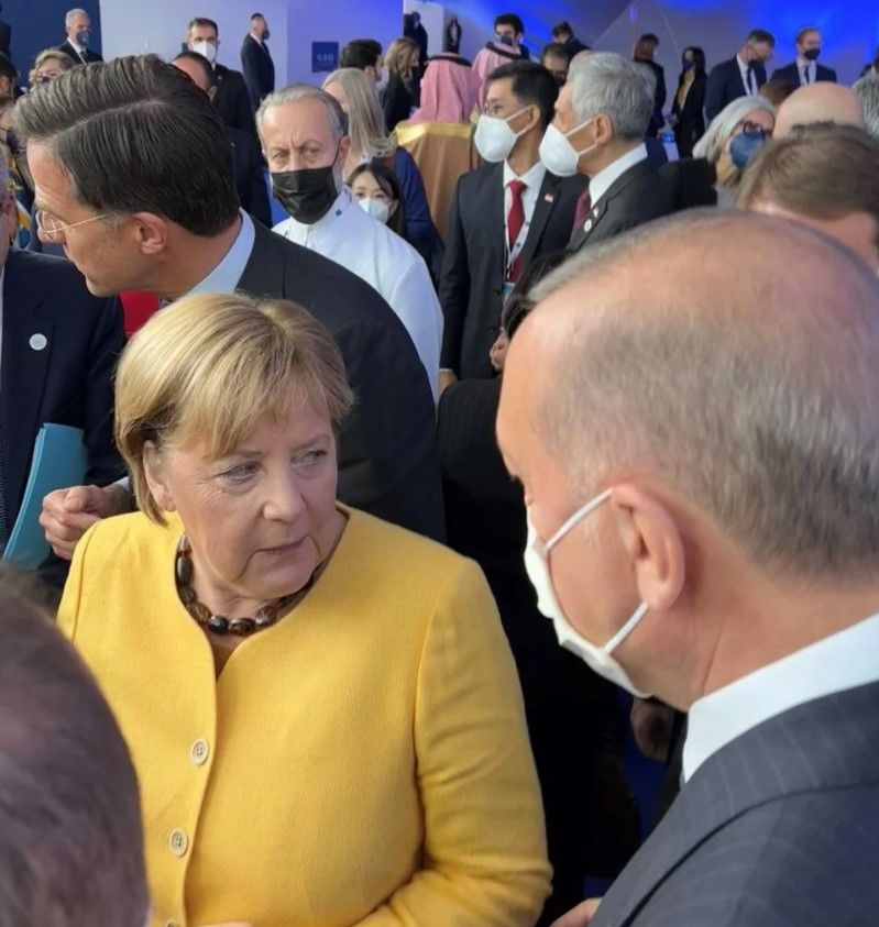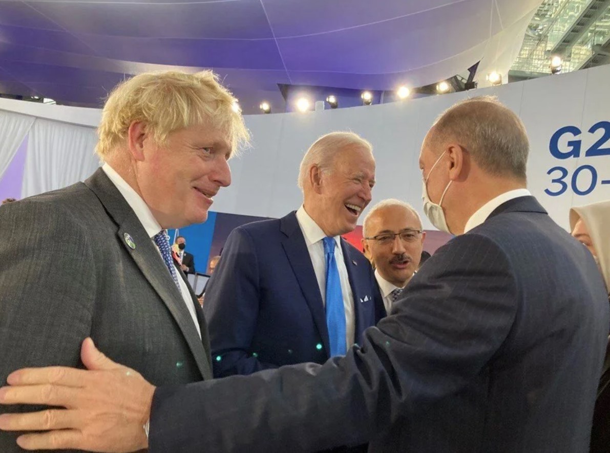 Cumhurbaşkanlığı İletişim Başkanı Fahrettin Altun, Cumhurbaşkanı Erdoğan'ın zirveye katılan ABD Başkanı Biden, İngiltere Başbakanı Johnson ve Almanya Başbakanı Merkel'le sohbet ettiği anların fotoğraflarını paylaştı.