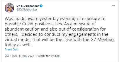 Bakan Jaishankar, Twitter hesabından yaptığı açıklamada, "Dün muhtemel Kovid-19 vakalarıyla temasta olduğumuzu öğrendik. Tedbir olarak ve diğerlerini riske atmamak adına görüşmelerimi çevrim içi gerçekleştirmeye karar verdim. Bu, bugün yapılacak G7 toplantısında da geçerli olacak." ifadesini kullandı.