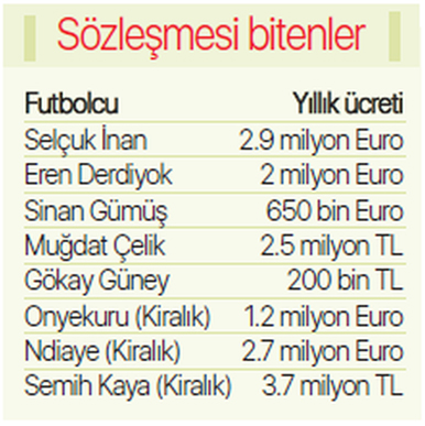 Galatasaray’da değişim vakti... Çifte kupaya uzanan Sarı-Kırmızılılar kadroda ciddi bir revizyon yapacak. Özellikle sözleşmesi bitecek futbolcuların büyük bölümüyle yollar ayrılacak. Kadro dışı olan Eren Derdiyok’un yanı sıra Muğdat Çelik ve Sinan Gümüş gönderilecek. Kaptan Selçuk İnan’ın durumu ise tamamen Fatih hocaya bağlı. Bu sezon 2 milyon 950 bin Euro kazanan Selçuk, ücreti ciddi oranda indirmesi halinde yeni kontrata imza atabilir. İmparator, kiralık sözleşmesi biten futbolcular arasından ise Onyekuru’nun mutlaka kalmasını istedi.