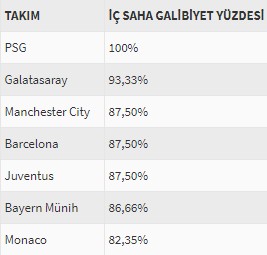 Paris Saint Germain ve Galatasaray'ın ardından Avrupa'da en iyi iç saha galibiyet yüzdesine sahip takımlar Manchester City, Juventus, Barcelona, Bayer Münih ve Monaco oldu.
