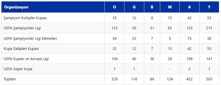 Sarı-kırmızılı takım, Avrupa organizasyonlarındaki müsabakaların 116'sından galibiyetle ayrılırken 124 karşılaşmada rakiplerine mağlup oldu. Galatasaray, 89 mücadeleyi ise beraberlikle tamamladı.