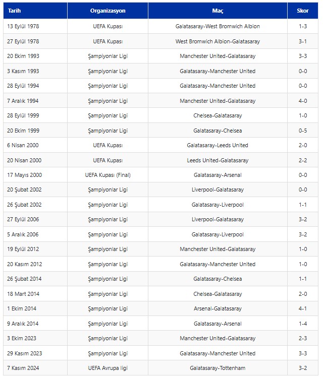 Sarı-kırmızılı takımın UEFA organizasyonlarında İngiliz temsilcileriyle yaptığı maçlar ve aldığı skorlar şöyle: